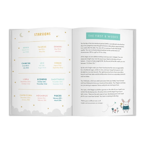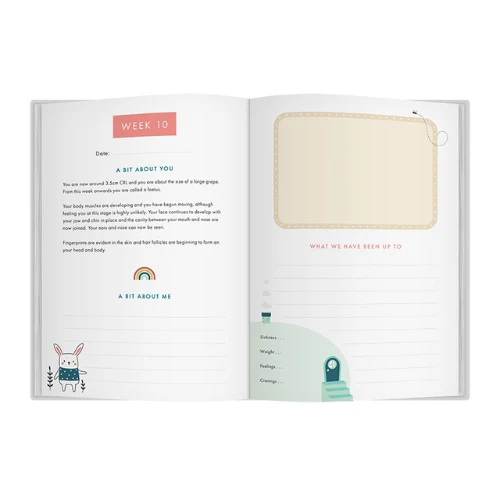 We love that the baby development information in this book has been so carefully researched with input from embryologists and specialist doctors. The journal is high quality, with a lovely fabric and gold cover, and thick internal pages. Each page is beautifully illustrated, with a lovely set of spreads for each week to be completed. There’s the right amount of room for a mum-to-be to have time to complete it each week, and the design is charming, featuring a sweet little rabbit and friends. There’s also space for scan images, little footprints and photographs.