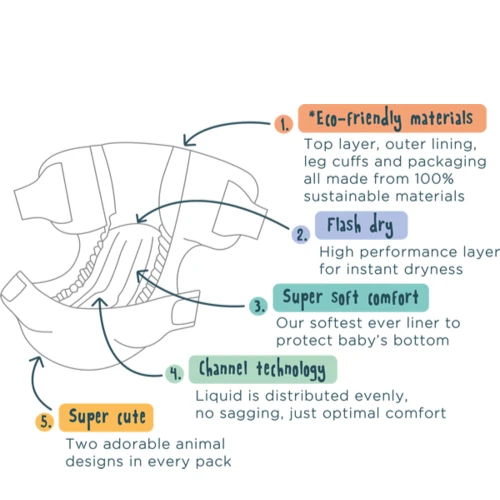 Patented channel technology to evenly distribute liquid around the nappy, which means no sagging and up to 12 hour leak protection.