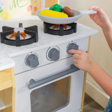 The KidKraft Fresh Harvest Kitchen is a streamlined play kitchen that incorporates natural-looking elements for an interactive toy that is open to endless imaginative possibilities.
