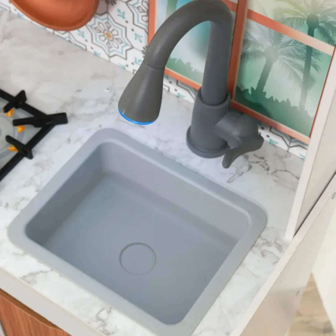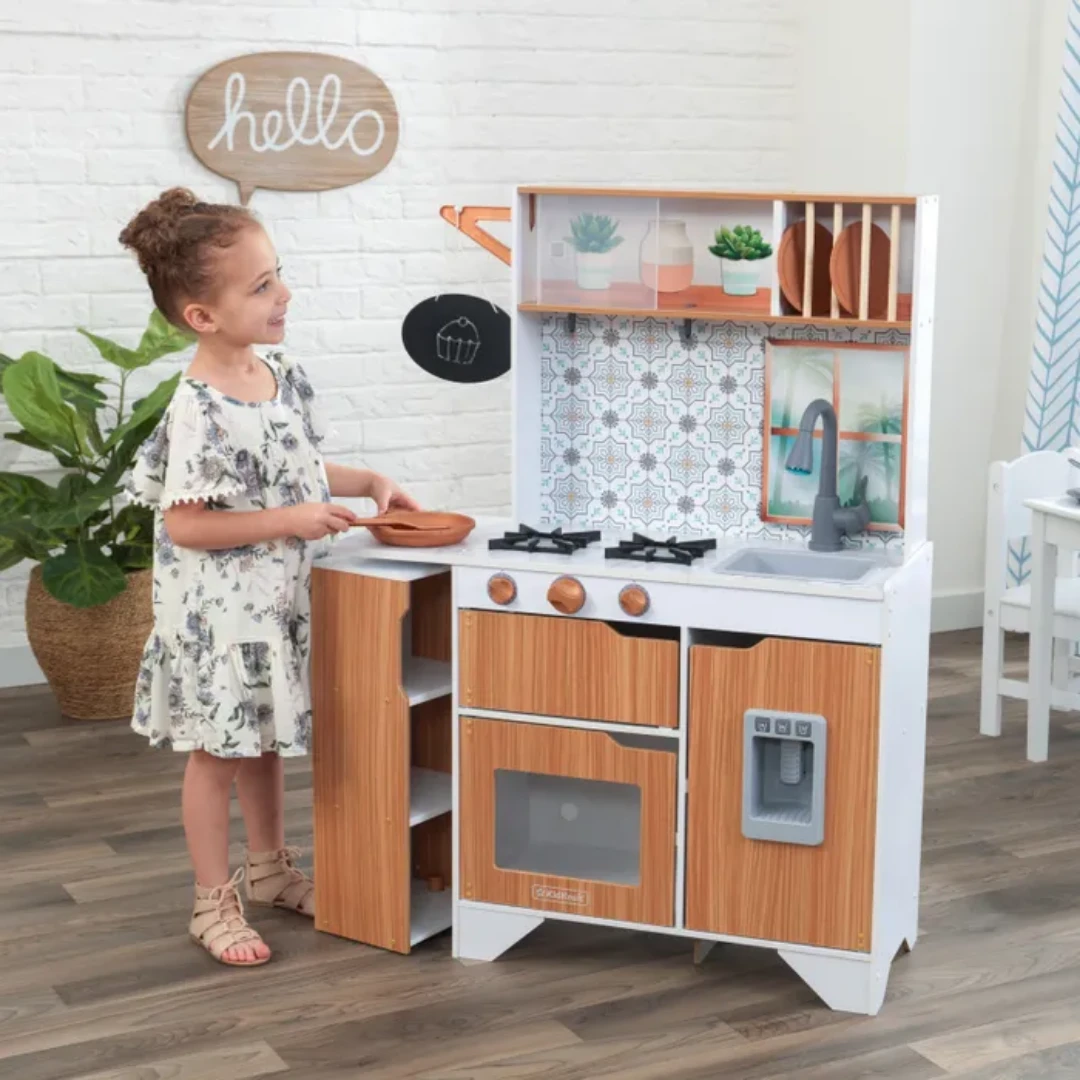 It’s time to cook in style! The KidKraft Taverna Play Kitchen is streamlined and stylish, ready to inspire pretend meals of extreme creativity. The mod marble-esque countertops house two burners, a sink and a faucet with