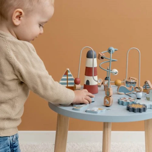 Stand up to play! Discover all the many activities this table has to offer. Help the seagulls bring the beads along the spiral. Or build a lighthouse. Complete the puzzle, turn the wheels and cross the ocean with the little boats. This wooden multi-activity table challenges your little one in many ways. There are 5 activities to explore that each support the development of fine motor skills. Thanks to the safe and balanced design, the activity table also encourages standing up. And staying up! Because the many features will keep your toddler engaged for a while.