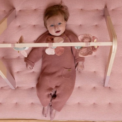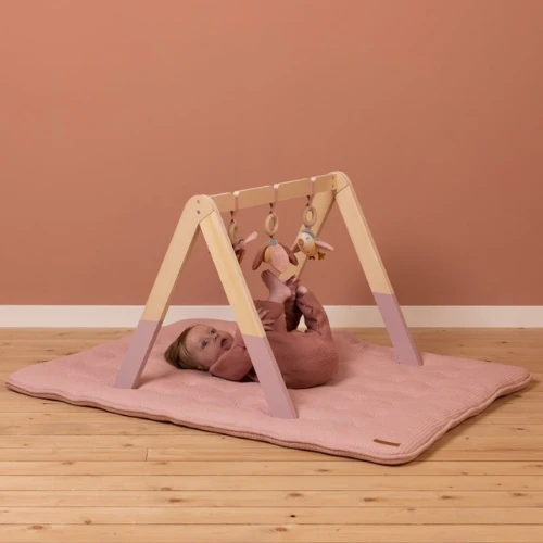 Lift those little arms! Curious babies are guaranteed to have a good time with this natural wooden baby gym. It features three different flower-themed activity toys that will do all the entertaining, including a cheery little bird, a crinkly butterfly and a colourful flower. Made for hours of enjoyment, it develops hand-eye coordination, enhances motor skills and stimulates the senses every time they grasp for one of the hangings.