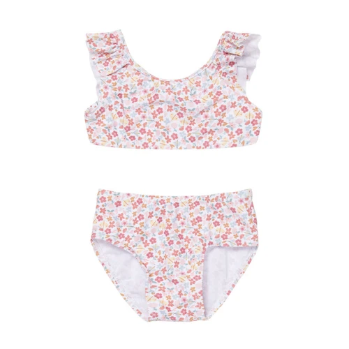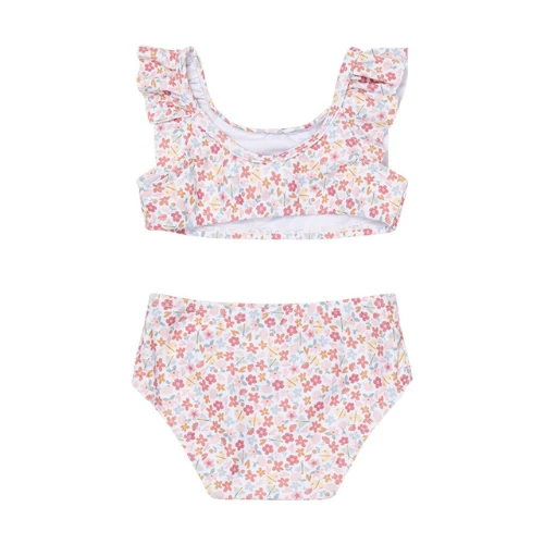 Swim or flaunt?! This two-piece bikini with flounced shoulder straps is perfect for both! The fit is comfortable for swimming and playing all day. And the trendy design will make this your favourite summer outfit. The ruffled shoulder straps add an adorable touch of style to the multi-coloured bikini set covered in Summer Flowers. The set is made from UV protective recycled polyester and is available in sizes 62/68, 74/80, 86/92 and 98/104. Mix and match the bikini top and bottoms with the ruffle bikini bottoms or long sleeved rash guard from the Summer Flowers collection to stay on trend all summer long. Don’t forget to always use sunscreen lotions to protect your little one.