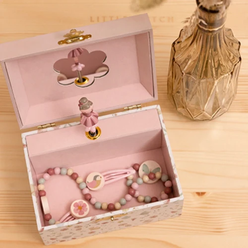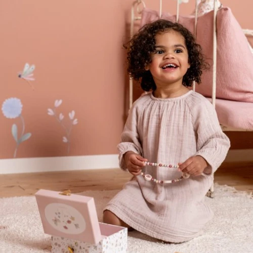 Compliment your look of the day with this cute set of wooden jewellery. The set is inspired by the soft pastel-hued colours and beautiful illustrations of the Flowers & Butterflies collection. With the necklace, bracelet and two hair clips you will look so pretty! Combine with the musical jewellery box to store the set in style.