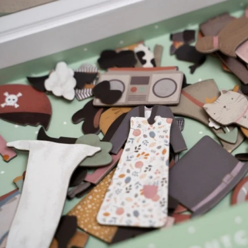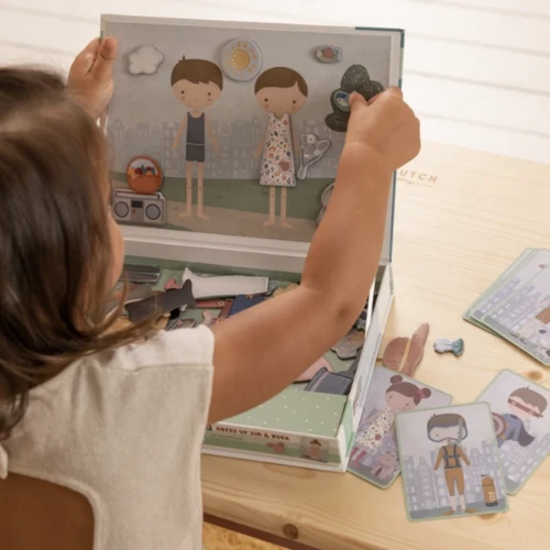 Play dress up with Jim & Rosa! With this magnetic puzzle you can copy the outfits of the cards on the board with magnetic pieces. Or use your own fantasy. There are endless combinations that guarantee lots of fun while encouraging vocabulary and coordination. At home, but also on the road.