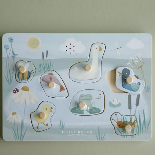 Meet Goose and his friends, recognize their shapes and learn their individual sounds with this lovely sound puzzle. Put the animal correctly in the puzzle board and listen to its splash, croak or buzz.