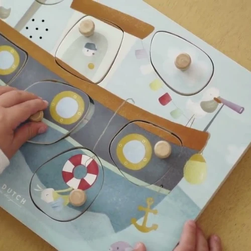 Find all the seagulls on the fisherman’s boat that is on its way to Sailors Bay. Splash, whistle and bang! Lift the pieces one by one and explore all the funny sounds. The screaming sea gulls soaring around to catch some fish! Or the sleepy pelican in the cabin below deck. And who’s that steering the boat? Don’t forget to blow the horn when you’re ready to go! This engaging puzzle with 7 sounds stimulates coordination and vocabulary. The sensors will respond when lifting a puzzle piece and revealing the illustration underneath. Batteries (2 x AAA) are not included.