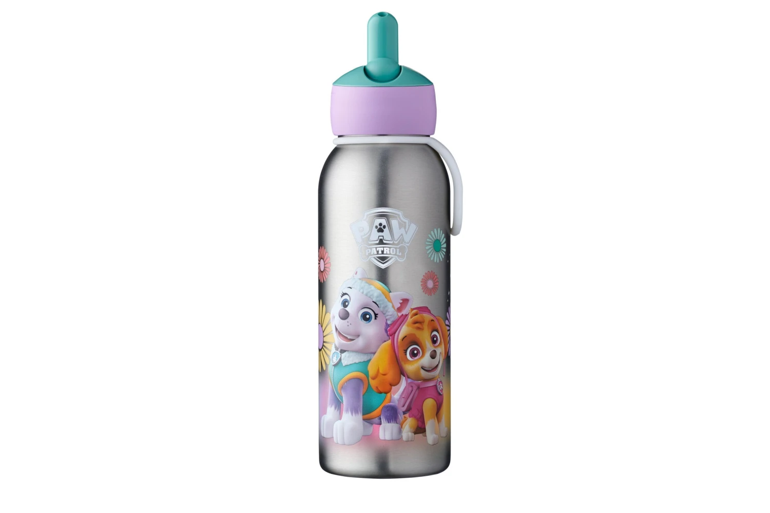Stay cool on the playground with this insulated flip-up bottle with a Paw Patrol Girls motif. The insulated bottle will keep your child’s drink refreshingly cool all day long. The bottle has a practical flip-up drinking system, easy for even the smallest children to use. Just flip up the spout to drink! The spout is attached to a straw inside the bottle. It’s guaranteed leakproof, so the bottle can be stored safely in a school bag, but it also has a handy loop to make it easy to carry. The insulated bottle is also suitable for carbonated drinks. When used for carbonated drinks we recommend to use the bottle without the straw. The bottle is completely BPA-free and easy to clean. To ensure you can enjoy your stainless steel bottle for a long time, we recommend hand wash only. The cap is dishwasher safe.Â