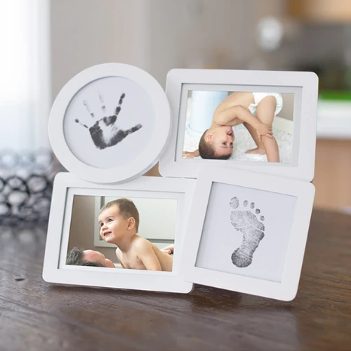 Display your newborn baby’s adorable photos and prints in style with Pearhead’s babyprints collage frame. This modern white, wooden multi-frame includes everything you need to create a personalized keepsake with your newborn’s tiny prints. The clean-touch ink pads included ensure baby’s hands and feet will never touch the ink! To create an impression, make sure the ink is facing down on the included white cards and press your baby’s hand and foot separately onto the clean-touch ink pad. Your baby’s tiny prints will be left on the cards without any ink on baby! Let dry for 1-2 days. Then you can place the prints in the frame along with two adorable 3” x 4” photos of your newborn baby. The frame has silver details and includes an acid-free beveled mat, adding an elegant touch. It also includes an easel to easily stand on any desk or table. Two-time use maximum. For newborns only. Ink pads will accommodate hand/feet up to 2.25” wide x 3.5” long. This frame is the perfect baby shower gift for any expecting parents! Now you will always be able to remember how little your baby’s piggies were and cherish them with Pearhead’s babyprints collage frame. Product dimensions: 11.19” W x 9.5” H x .94” D; Photo insert: 3” x 4”