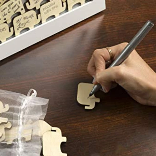 - Simply set the frame out during your baby shower and have your guests write their well wishes on the elephant pieces; they can then drop the piece inside the frame through the top opening slot