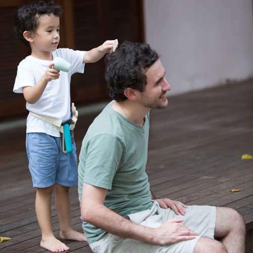Let’s start a hair salon and invite all the dolls and stuffed toys. PlanToys Hair Dresser set will provide all the items needed for a top notch hair style: scissors, hair dryer, comb, straightener, hair clipper, and a stylists waist bag with adjustable belt to hold all of the tools (and to store them when it is time to tidy up). Our hairdresser set encourages imaginative and creative play for preschoolers. The items are sized for small hands: the salon bag measures 4.9 x 9.1 inches.