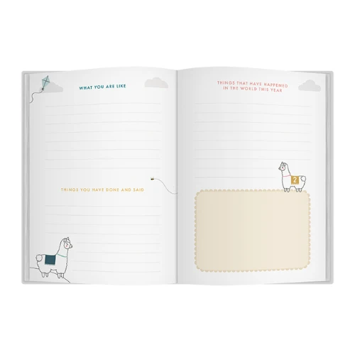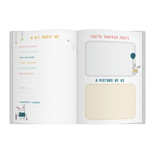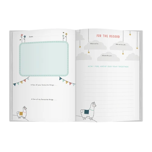 This fabric-covered, beautifully colour illustrated journal, complete with foil blocking detail, has been lovingly created featuring charming little rabbits, penguins, llamas and other animals. It references parent details, but not specifically mothers or fathers, and is therefore suitable for all families. With spaces for photos and memorabilia, it provides prompts to help parents chronicle family experiences and unrepeatable moments, including the child’s growth, development and personality, precious family memories and the wonderful emotional journey.