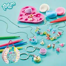 Craft and decorate beautiful Accessories! With Totum you can make your own trendy accessories! First you make cheerful figures, then you make jewelry and key rings! The craft set comes with 4 colors of air-drying malleable material, silicone molds, 4 earrings, 4 stud earrings, 2 metal key rings, 2 ball chains, a thin marker and 4 colored markers. The material with which you make the figures is very suitable for children: it is a kind of clay that you knead into a shape in the molds. With the ‘Totum Make your own Trendy Accessories’ you can make jewelry and key rings with, among other things, unicorn donuts, ice creams and fish. Comes in a colorful round case with rope handle